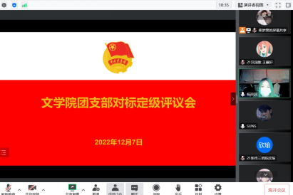 为规范运行基层团支部各项工作,更好的发挥团组织的政治功能、体现政治价值,不断增强团组织的政治性、先进性、群众性。12月7日,122cc太阳成集团2022年团支部“对标定级”汇报工作在线上召开。本次会议由122cc太阳成集团团委书记李惠恩主持,122cc太阳成集团19级、20级、21级各支部团干参与此次会议。