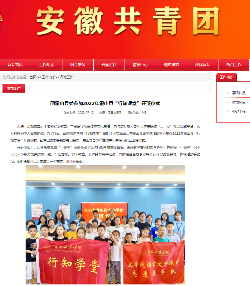 7月11日,霍山“行知学堂”开班仪式圆满结束,霍山县团县委副书记金星同志,霍山县青少年活动中心党支部书记阮家军出席开班仪式。