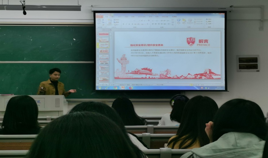 122cc太阳成集团辅导员李惠恩于4月15日在滨湖校区铭传楼B303教室召开了春季安全主题教育会,会议召集了122cc太阳成集团各班班干和寝室长。李惠恩与同学们展开“同上一堂课”活动,共同了解国家安全知识,还列举了危害国家安全的犯罪实例,强调了维护国家安全的重要性。