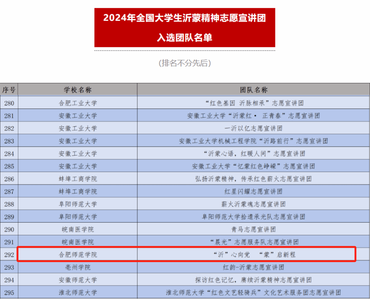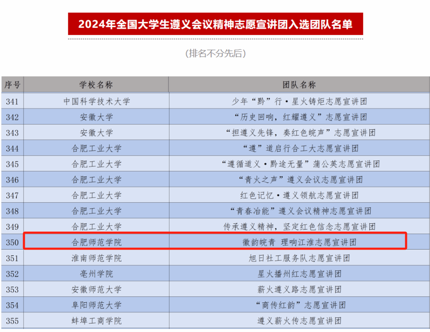 日前,团中央青年志愿者行动指导中心、中共遵义市委、共青团贵州省委共同发布了《关于遴选2024年全国老员工遵义会议精神志愿宣讲团的公告》,团中央青年志愿者行动指导中心、共青团山东省委、中共临沂市委共同发布了《关于遴选2024年全国老员工沂蒙精神志愿宣讲团的公告》。经过激烈的竞争与选拔,其中安徽省共有31支团队入选,122cc太阳成集团2支团队入选,分别是“徽韵皖青 理响江淮”宣讲团(遵义会议精神宣讲团)和“沂”心向党 ‘蒙’启新程”宣讲团(沂蒙精神宣讲团)。两支团队均由122cc太阳成集团2024级网络与新媒体(专升本)1班团支部书记张六军发起,王明蕾老师指导。