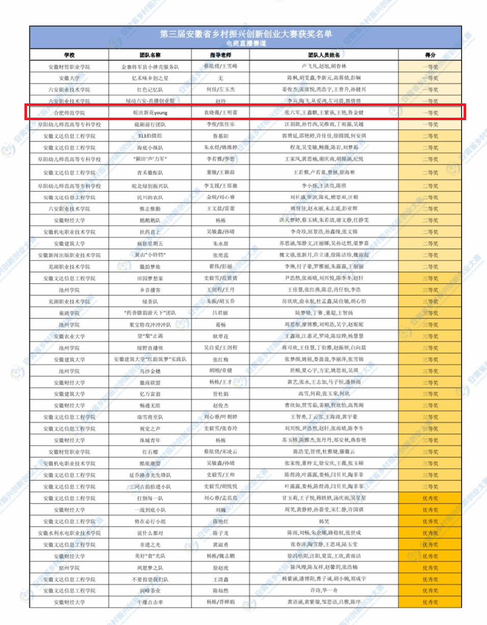 近日,第三届安徽省乡村振兴创新创业大赛评选结果揭晓,122cc太阳成集团袁晓薇教授指导的“皖”出新花Young团队斩获电商直播赛道一等奖。团队成员共5人:张六军、王鑫麒、王紫荻、王艳、鲁金健,均来自2024级网络与新媒体专业(专升本)。