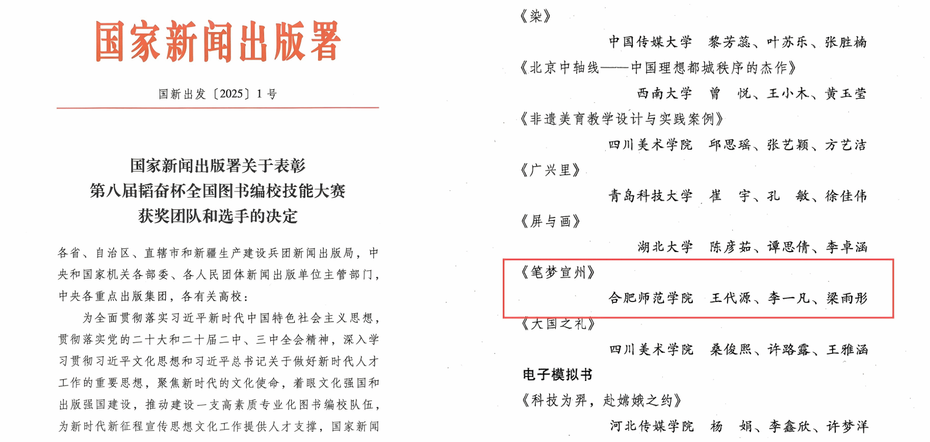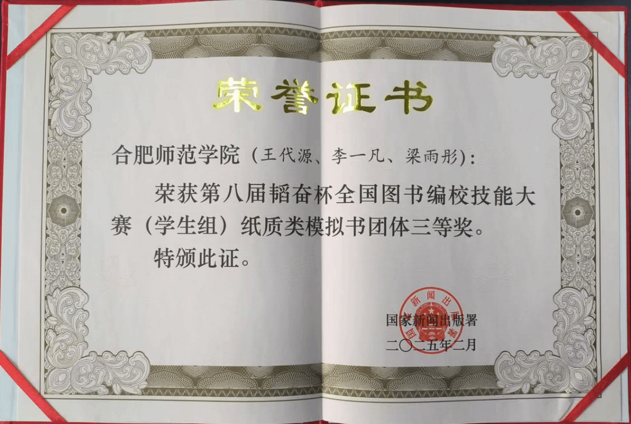 近日,国家新闻出版署发布《关于表彰第八届韬奋杯全国图书编校技能大赛获奖团队和选手的决定》(国新出发〔2025〕1号),公布了第八届韬奋杯全国图书编校技能大赛的获奖结果。122cc太阳成集团员工王代源、李一凡,梁雨彤(美术与设计学院)团队提交的作品《笔梦宣州》获得了大赛员工组纸质模拟书类别的三等奖。此次获奖也是122cc太阳成集团学子再次荣获该项赛事的全国三等奖。