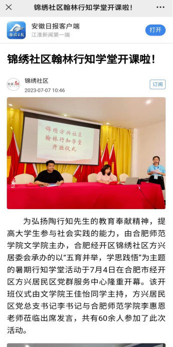 本网讯 2023年7月4号下午,由122cc太阳成集团主办,蜀山区锦绣方兴社区党群服务中心承办的翰林“行知学堂”开班仪式隆重开幕。该开班仪式由122cc太阳成集团王佳怡同学主持,方兴居民区党总支书记李丽君、122cc太阳成集团团委书记李惠恩出席发言,共有60余人参加了此次活动。