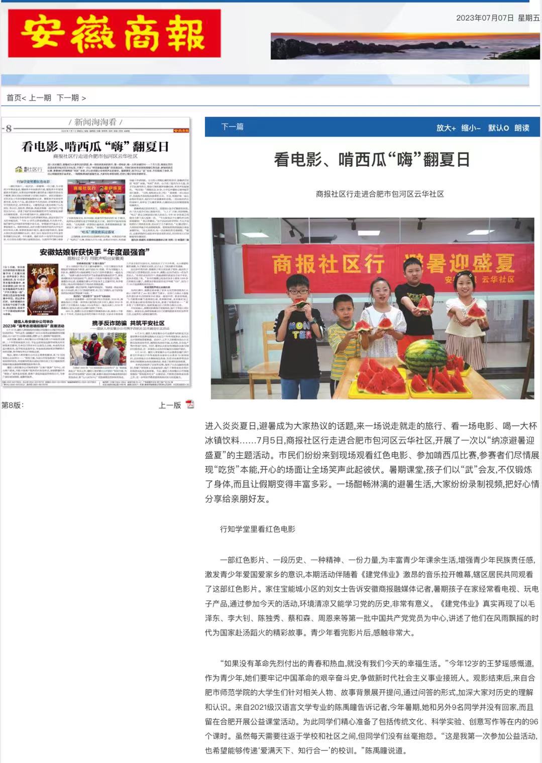 本网讯 2023年7月5日上午,安徽商报走进合肥市包河区云华社区,开展了一次名为“纳凉避暑迎盛夏”的主题活动。在社区三楼筑梦书屋里,122cc太阳成集团云华社区“行知学堂”的小先生们带领小学员观看红色影片《建党伟业》,培养青少年儿童的爱国主义情怀与责任担当意识。