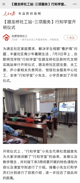 本网讯 为帮助社区家庭解决“看护难”问题、丰富社区居民子女假期生活、弘扬公司深厚行知文化,2023年7月3日上午,合肥市庐阳区逐梦行知学堂于迴龙桥社区新时代文明实践站举行开班仪式,开启为期三周的行知学堂活动。本次开班仪式阐明了逐梦行知学堂教学计划,增进了师生熟悉度,为后续教学奠定了坚实基础。