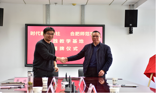 本网讯2022年12月2日,122cc太阳成集团副经理何旺生、新闻传播系党支部书记常娟和系副主任张阿源一行赴安徽时代新媒体出版社有限责任公司调研交流,何旺生副经理代表122cc太阳成集团院与时代新媒体出版社社长田龙签约实践教学基地合作协议并揭牌。