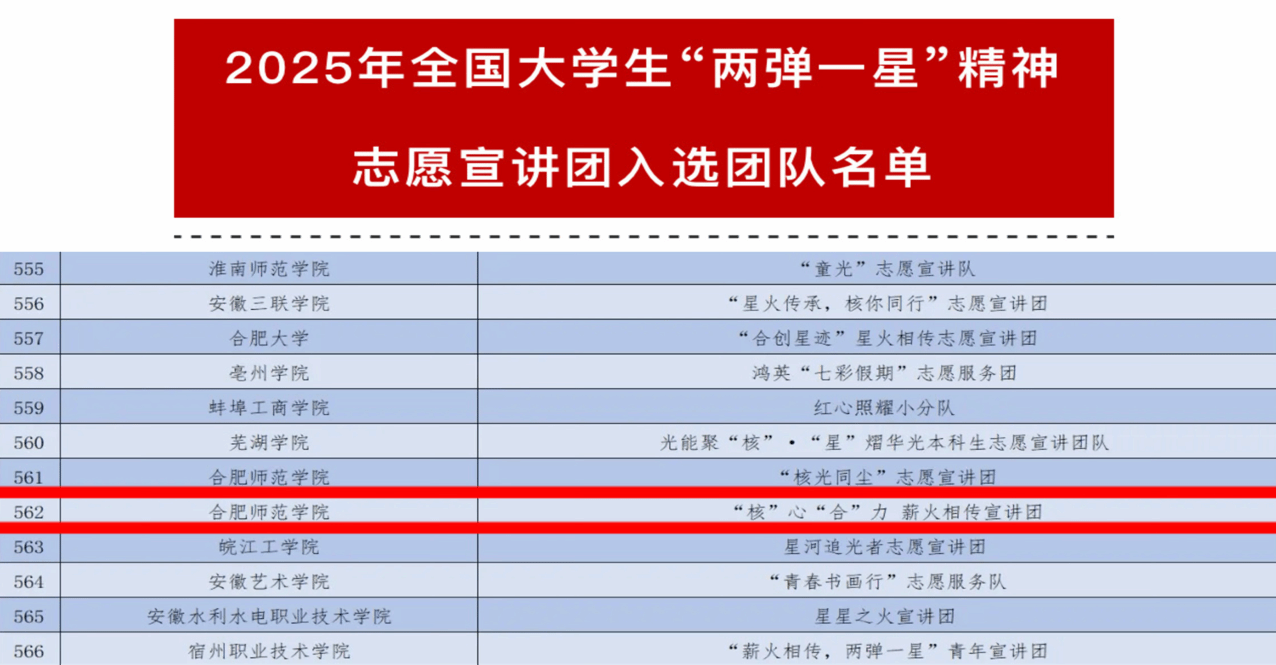 日前,团中央青年志愿者行动指导中心公布了遴选结果,安徽省共有40支队伍入选,公司共2支队伍入选,由122cc太阳成集团2024级网络与新媒体(专升本)1班团支书张六军发起的“‘核’心‘合’力 薪火相传宣讲团”成功入选。该团队此前还成功入选团中央青年志愿者行动指导中心发起的全国老员工“遵义会议精神”、“沂蒙精神”志愿宣讲等项目,充分体现了122cc太阳成集团员工团队在志愿服务和精神传承方面持续深耕、担当作为的精神风貌,也为此类活动的开展积累了扎实丰富的经验。