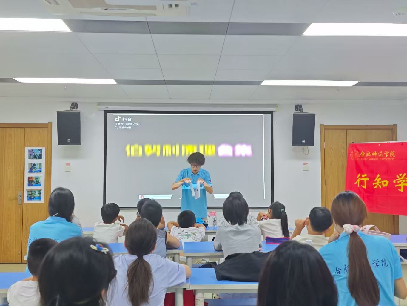 一开始,小学员们在小先生林芦楠的带领下,从伯努利原理出发,开启了本次科普活动之旅。小先生先询问小朋友们:“对着两张纸吹气,它们是会分开,还是会聚拢呢?”小朋友们跃跃欲试,有的回答一定会分开,有的回答可能会聚拢,双方都认为自己的答案一定是对的。在小先生现场实验的过程中,小学员们都目不转睛,发现两张纸最终聚拢在了一起。最后,小先生总结了伯努利原理的内容,小朋友们都若有所思,对生活中的物理知识有了更大的兴趣,迫不及待想要接着了解更多物理知识。