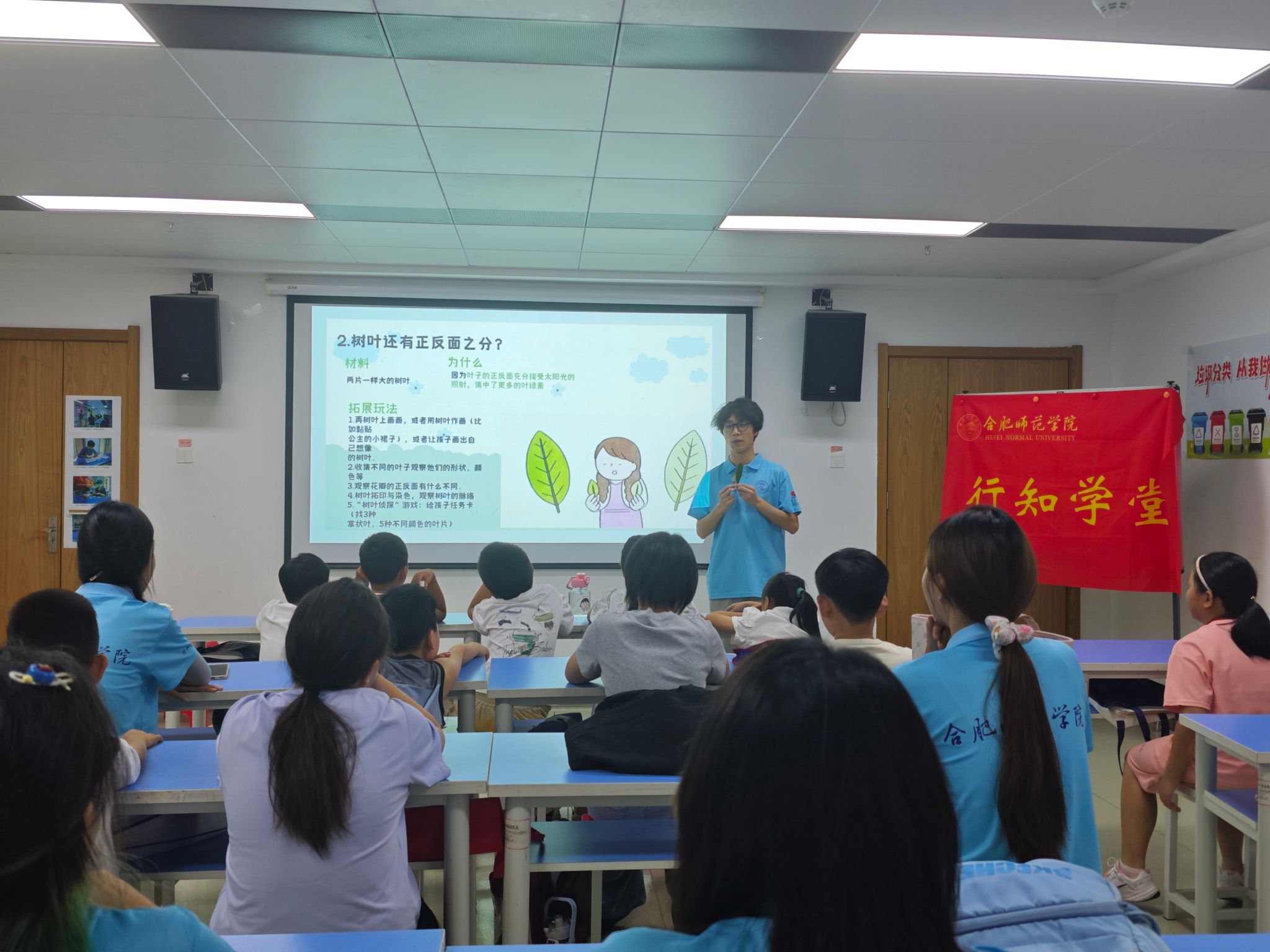 此外,课程还串联起之前的甲骨文树叶写字活动,在“树叶的正反面”科普探讨中,小学员们发现树叶的一面颜色比较深,一面颜色比较浅,他们觉得颜色深的那面是正面颜色浅的那面是反面,并且在小先生的指导下,他们发现树叶的脉络非常的均匀漂亮,在观看科普教案后,小朋友们得知是因为光合作用的影响,导致树叶的正面吸收了更多的叶绿素,所以颜色更深,小朋友们不禁感叹太阳的神奇力量。