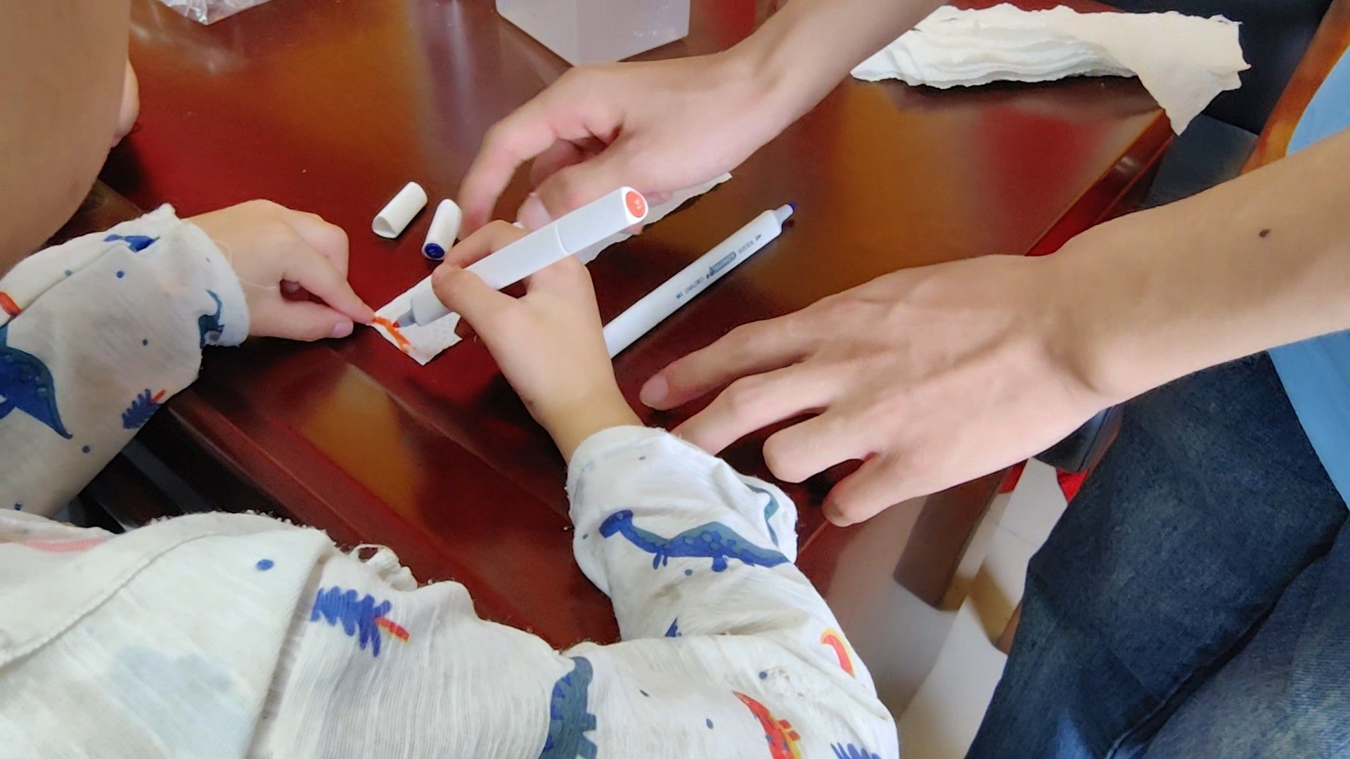 实验课开始,小先生展示了实验材料:一杯有颜色的水、纸巾、粗细各异的吸管、棉布以及海绵。在详细讲解实验步骤与安全注意事项后,孩子们迫不及待地动手操作起来。当他们把纸巾一端浸入彩色水中,神奇的现象发生了:水像是被一只无形的手牵引,沿着纸巾纤维缓缓上升,不一会儿,纸巾就被染上了绚丽的色彩。“哇,水真的往上跑了!”孩子们的惊叹声此起彼伏。