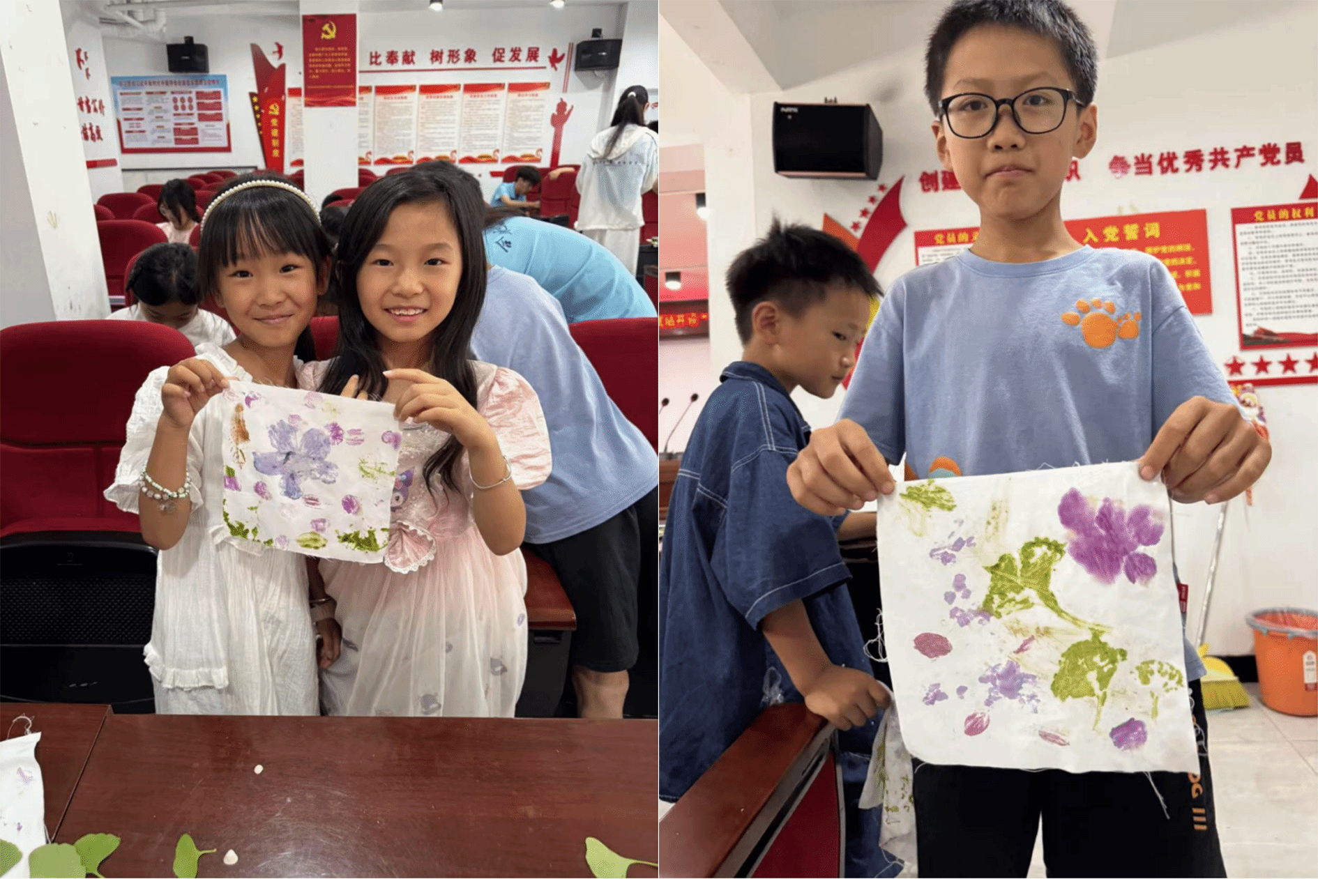 小学员何子瑶和张颜汐合作完成了一幅拓染画,她们高兴地展示这份作品。拓染画上的花朵鲜艳可爱,而她们大方展示的,正是夏天最绚丽的色彩。