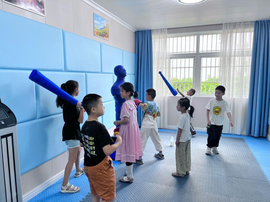 接下来,在小先生朱幸武的带领下,小学员们又来到了情绪发泄室。在遇到问题时,最好的方法便是进行合理的发泄。在发泄室内,小学员们挥起海绵棒,朝着假人打去,糟糕的情绪逐渐转变成欢声笑语。