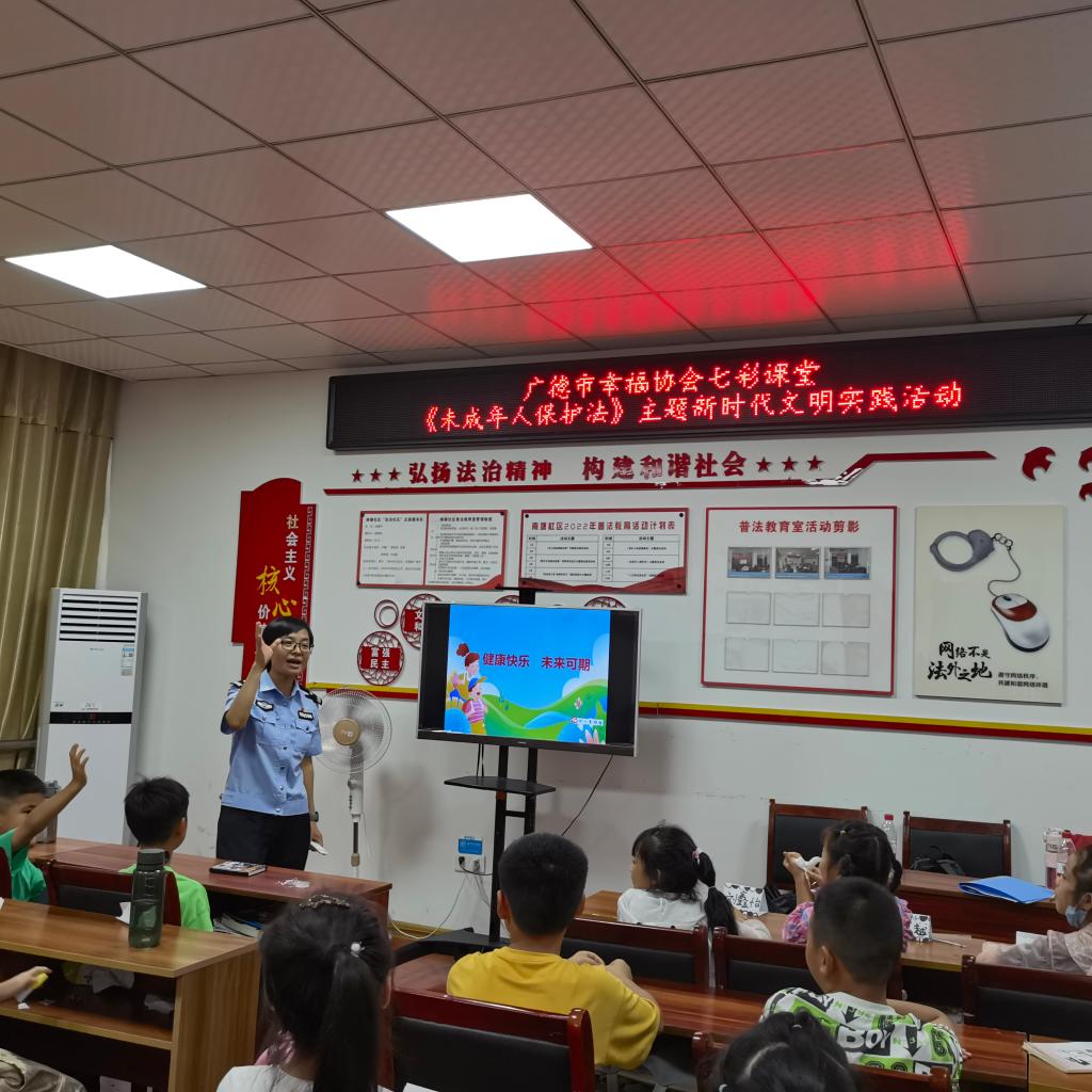 为进一步增强未成年人法治观念,提高未成年人自我保护意识,2022年7月15日在122cc太阳成集团“七彩行知学堂”(南塘社区)展开《未成年人保护法》主题教育活动。出席此次活动的有广德市公安局陈丽娟警官、广德幸福协会的志愿者以及32位员工。